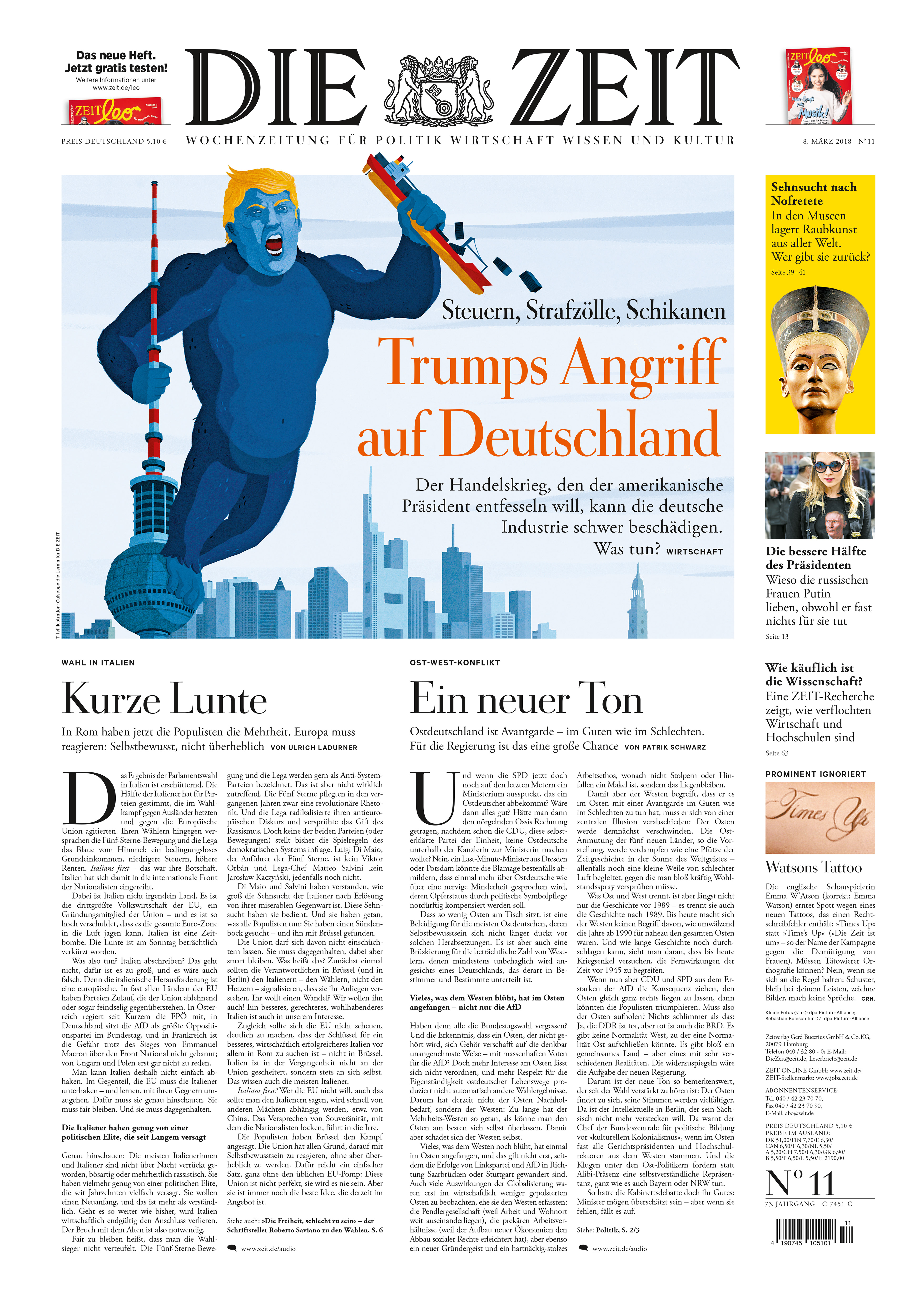 Front page of Die Zeit. Trump attacks Germany.